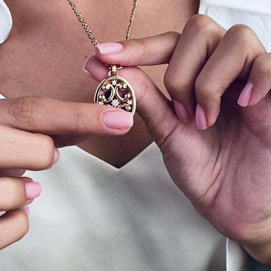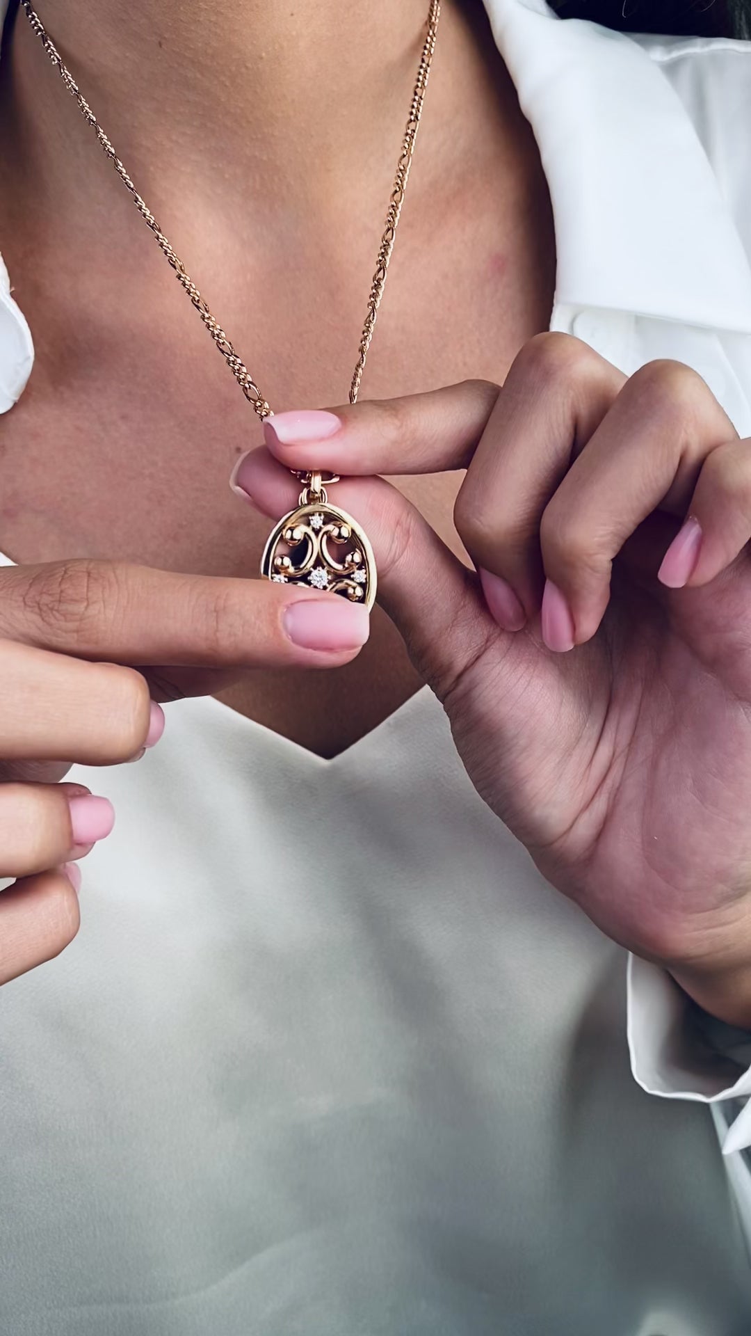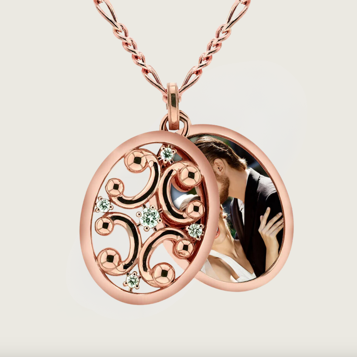 Rose altının zarif tasarımı ile süslenmiş bu fotoğraf madalyonlu kolye, en özel anılarınızı her daim yanınızda taşımanızı sağlar. İç kısmında sevdiklerinizin fotoğraflarını saklayabileceğiniz bu kolye, zarif detayları ve pırlanta taş süslemeleriyle dikkat çekiyor. Hem kişisel hem de anlamlı bir hediye arayanlar için ideal bir seçim olan bu madalyon kolye, her tarza uyum sağlayacak şekilde tasarlandı.