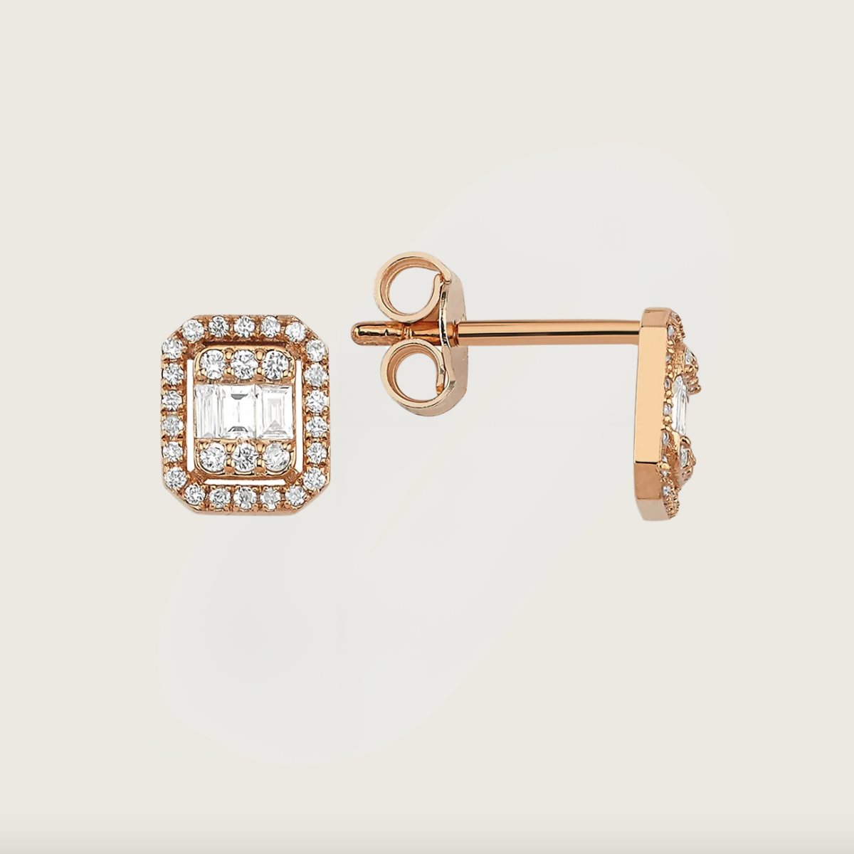 Modern sofistike tasarımın zarafetini yansıtan Pembe Dönüşüm Baget Pırlanta Küpe, 14 ayar rose altın üzerine işlenmiş baget kesim pırlantalarla göz alıcı bir ışıltı sunuyor. Dikdörtgen geometrik formuyla dikkat çeken bu şık küpeler, zarif yuvarlak pırlantalarla çevrelenmiş olup, her anınızda şıklığınızı tamamlayacak. Güvenli vidalı kapanışı ile hem konforlu hem de güvenli bir kullanım sunar.