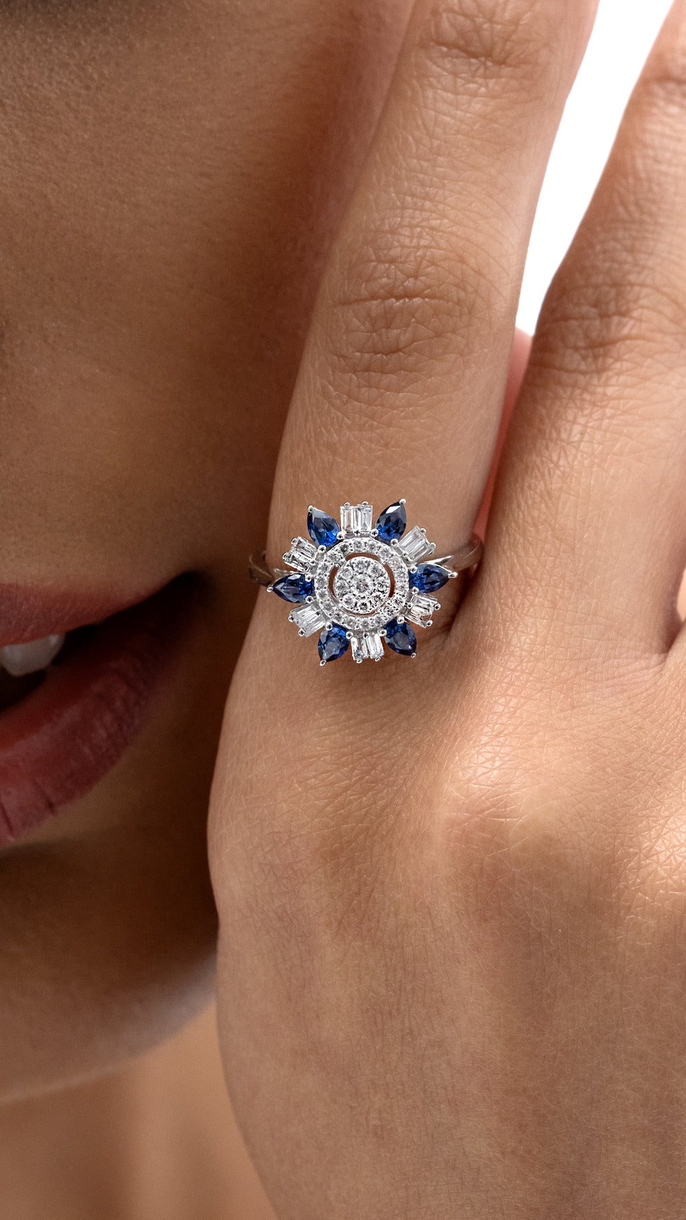 Bu büyüleyici yüzük, çiçek formunda dizayn edilmiş safir taşları ve baget pırlantalarla dikkat çekiyor. 14 ayar beyaz altın ile tasarlanan bu zarif parça, La Rosa'nın estetik anlayışını ve ince işçiliğini yansıtıyor. Safir taşlarının derin mavi tonları ve pırlantaların göz kamaştıran ışıltısı, parmağınızda adeta bir çiçek bahçesi yaratıyor. Zarafetin ve ihtişamın bir araya geldiği bu yüzük, hem özel günlerinizi taçlandırmak hem de stilinize benzersiz bir dokunuş katmak için ideal bir seçim.