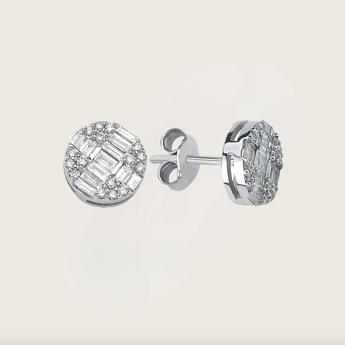 Ay tanrıçası Selene'den ilham alınarak tasarlanan bu 14 ayar beyaz altın küpeler, gece gökyüzündeki ayın huzur verici parlaklığını anımsatır. Baget kesimli ve yuvarlak detaylı pırlantalarla süslenen bu zarif saplama küpeler, her gün şıklığıyla göz kamaştırmanızı sağlayacak. Minimalist ama etkileyici tasarımı, günlük stilinize veya özel anlarınıza ışıltı katacak bir mücevher parçasıdır.