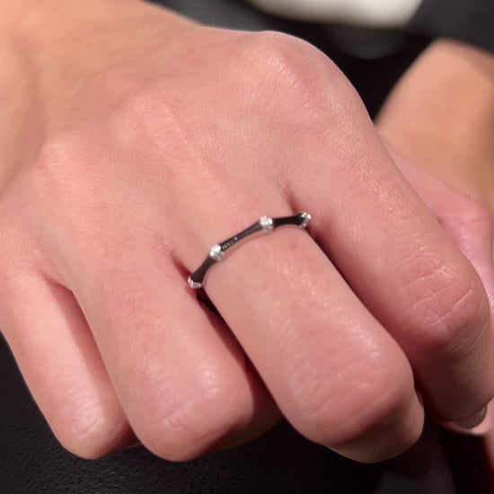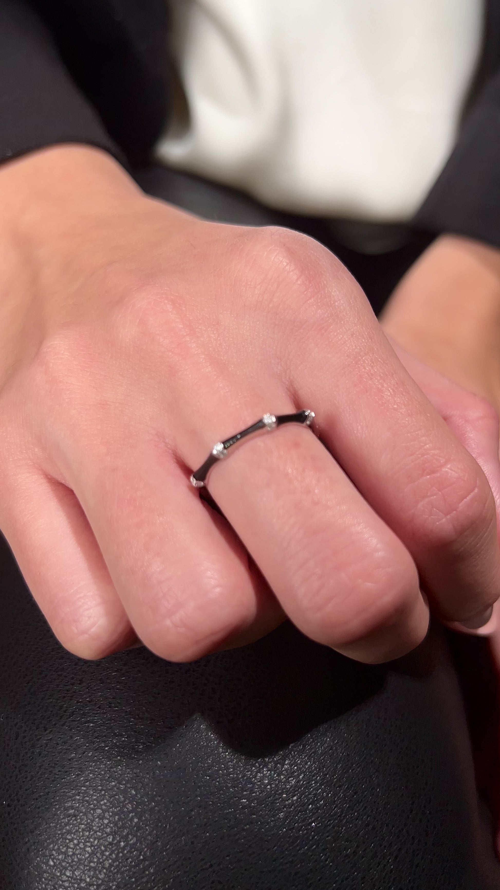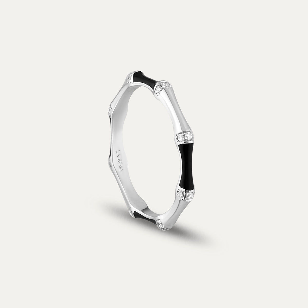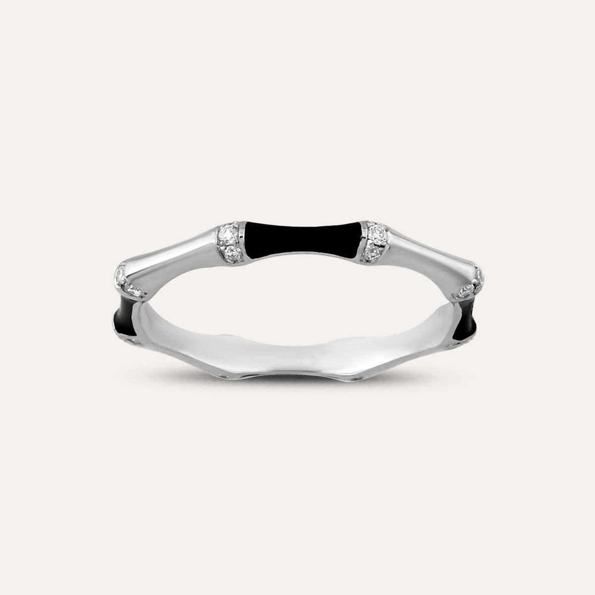 Zarif bir bambu dokusunu andıran bu siyah mine detaylı beyaz altın yüzük, modern tasarımı ve şık çizgileriyle öne çıkıyor. Beyaz altının parlaklığı, stratejik noktalara yerleştirilen pırlanta detaylarıyla birleşerek sofistike bir görünüm sunuyor. Yüzüğün dalgalı hatları ve siyah mine detayları, tasarıma özgün bir dokunuş katarak minimalist bir şıklık yaratıyor. Günlük kullanımda veya özel anlarınızda stilinizi tamamlayacak bu yüzük, her kombine mükemmel bir uyum sağlar.