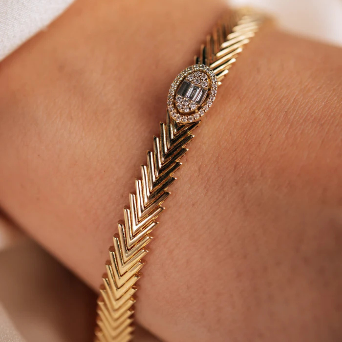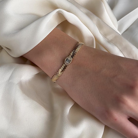Bu zarif bileklik, 14 ayar sarı altından yapılmıştır ve modern bir tasarımla birlikte doğanın güneş ışığından ilham alır. 9.95 gram ağırlığındaki bu bileklik, D1: 0.10 ct ve D2: 0.08 ct pırlantalarla süslenmiştir. Pırlanta yuvarlak kesim olup, bilekliğe zarif bir ışıltı katmaktadır. Her detayı incelikle düşünülmüş olan bu tasarım, gündüz ve gece şıklığını tamamlamak için mükemmel bir seçimdir. Hem güçlü hem de zarif bir görünüm sunan bu bileklik, benzersizliğiyle dikkat çeker ve her türlü kıyafete zarafet katar.