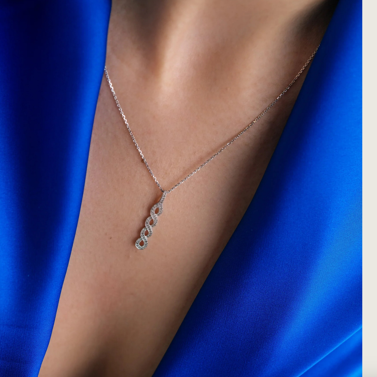 Bu zarif ve modern tasarımlı kolye, 14 ayar beyaz altın üzerine yerleştirilmiş parıltılı pırlantalarla süslenmiştir. Kolyenin üzerindeki sonsuzluk sembolü, sonsuz sevgi ve bağlılığı temsil eder. Günlük kullanımdan özel davetlere kadar her ortamda göz alıcı bir şıklık sağlar. Sonsuz Işıltı kolyesi, zamansız tasarımıyla dolabınızdaki en özel parçalardan biri olmaya adaydır.