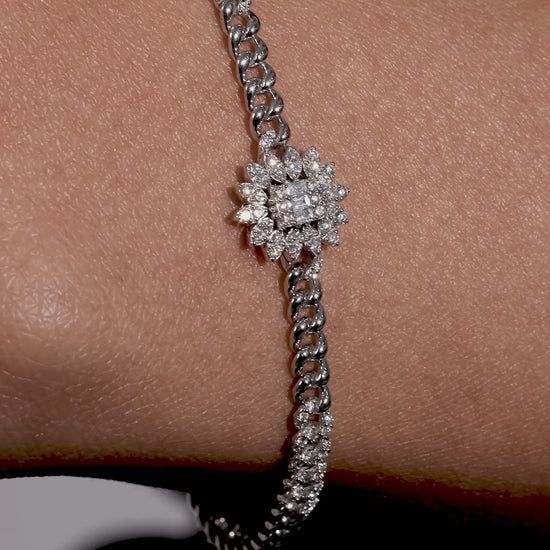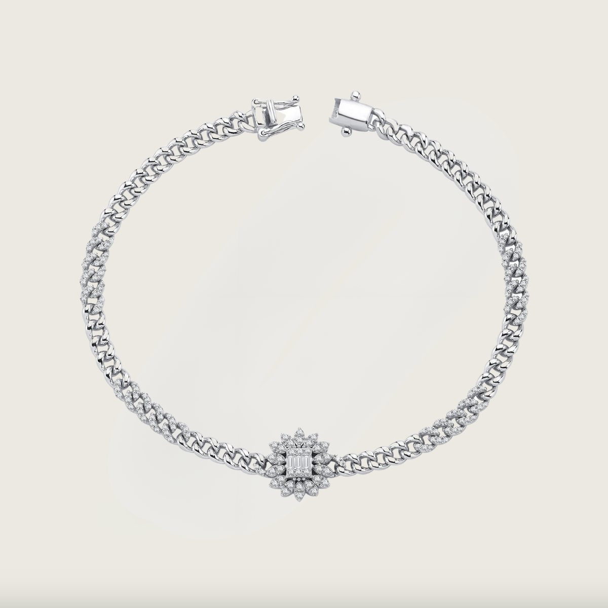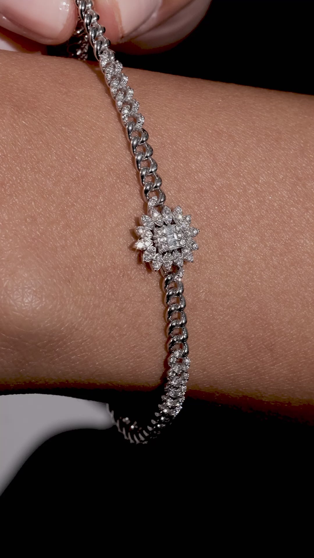 Bu zarif Sonsuz Parıltı bileklik, beyaz altının ışıltısıyla birleşen sofistike bir tasarım sunuyor. El işçiliğiyle hazırlanmış bu bileklik, ihtişamlı pırlantalarla bezeli detaylarıyla her ortamda dikkat çekiyor. Günlük stilinize elegan bir dokunuş katarken, özel günlerde de şıklığınızı tamamlayacak mükemmel bir seçimdir. Bilekliğin 14 ayar altın yapısı, zamansız zarafet sunarken, güvenli kilit sistemi sayesinde rahat bir kullanım sağlar.