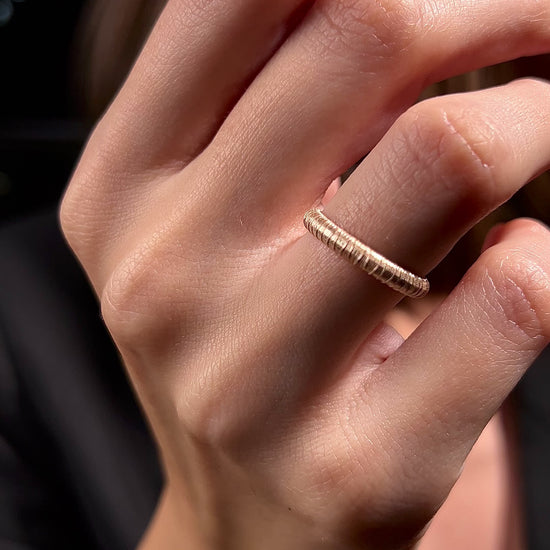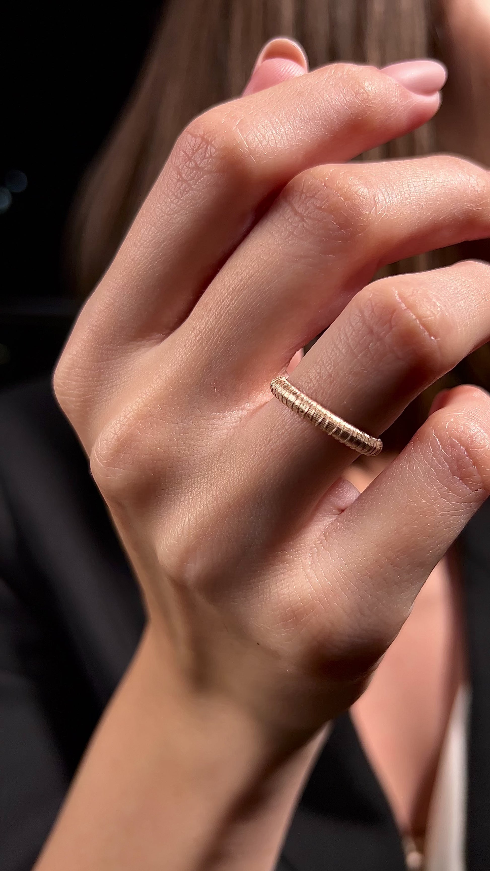 Dokulu yüzeyi sayesinde ışığı farklı açılardan yakalayarak zarif bir ışıltı oluşturur. Günlük kullanımda rahatlıkla tercih edilebilecek bu yüzük, aynı zamanda doğal ve sıcak görünümü ile alyans olarak da son dönemde trend haline gelmiştir. Modern ve minimal tarzları sevenler için hem şık hem de sade bir alternatif sunar.