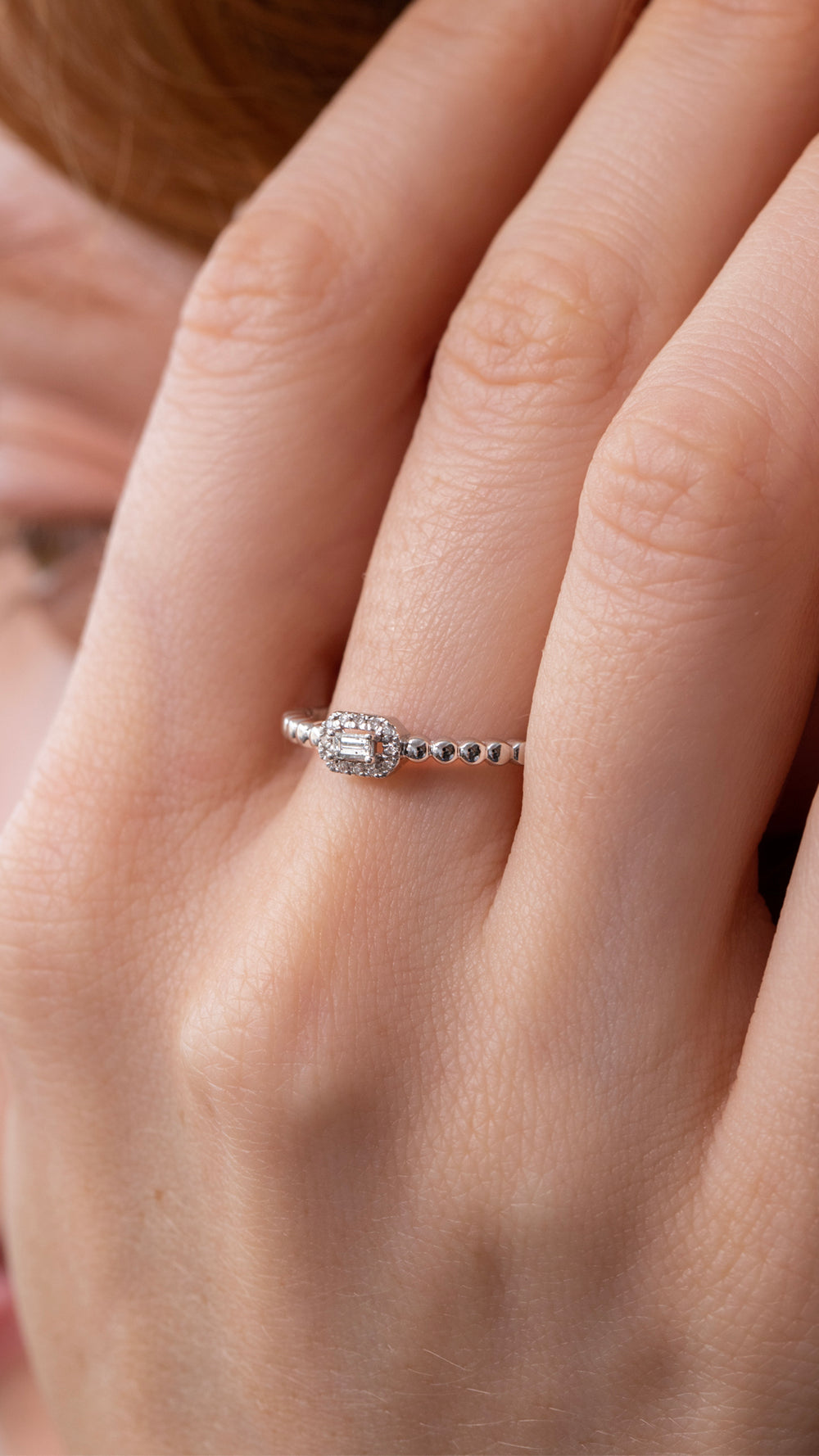 Baget kesimin ince detayları, ışıltısını en güzel şekilde yansıtırken, toplu dokulu yüzük bandı bu tasarıma modern bir dokunuş katıyor. Hem günlük kullanım için hem de özel günlerde tercih edilebilecek bu yüzük, zarif detaylarıyla stilinize ışıltı katacak.