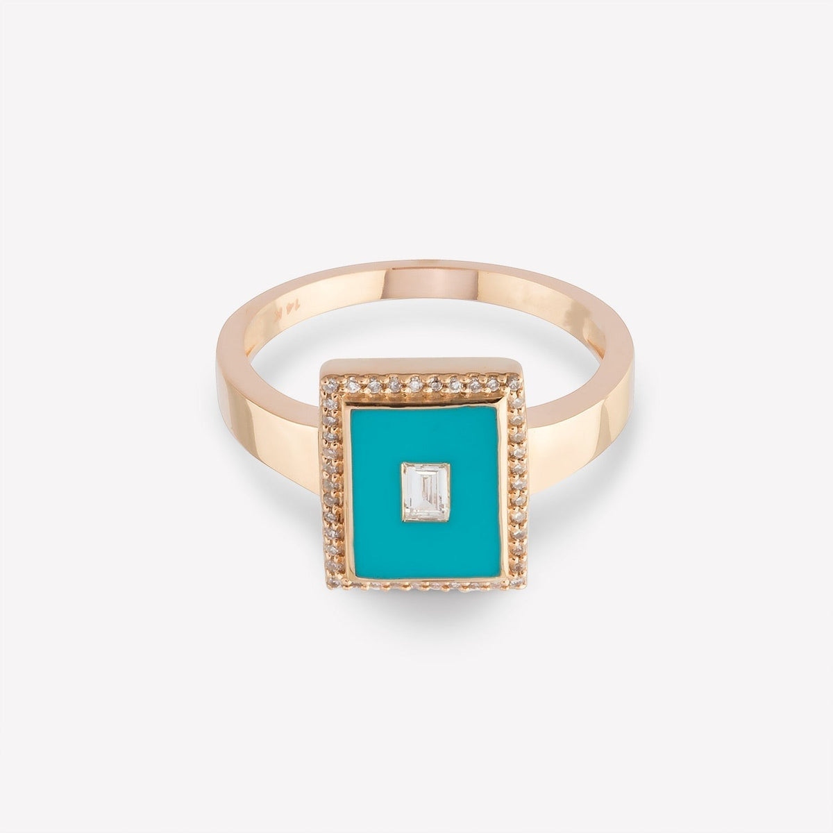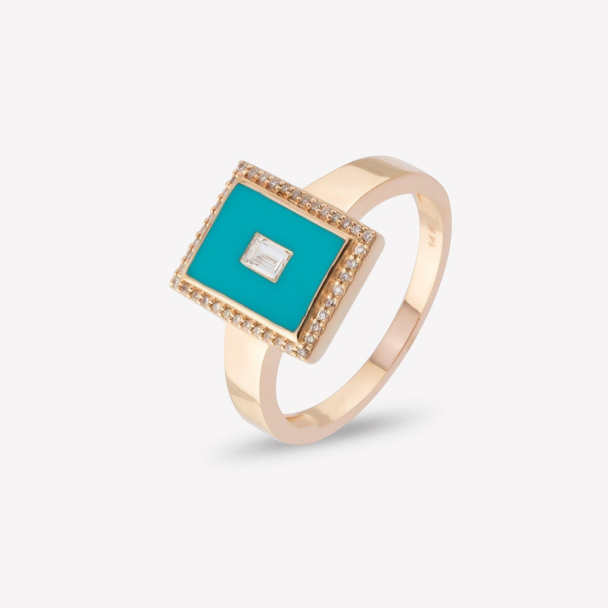 Modern ve cesur çizgilerin buluştuğu bu turkuaz mine detaylı baget pırlanta yüzük, zarif ve göz alıcı bir tasarım sunuyor. Rose altının sıcak tonlarıyla uyumlu turkuaz mine, tasarıma özgün bir dokunuş katarak stilinizi tamamlıyor. Hem günlük kombinlerinizde kullanabileceğiniz hem de özel günlerinizde parmağınızda taşıyabileceğiniz bu yüzük, modern zarafeti ile dikkat çeken şık bir seçenek.