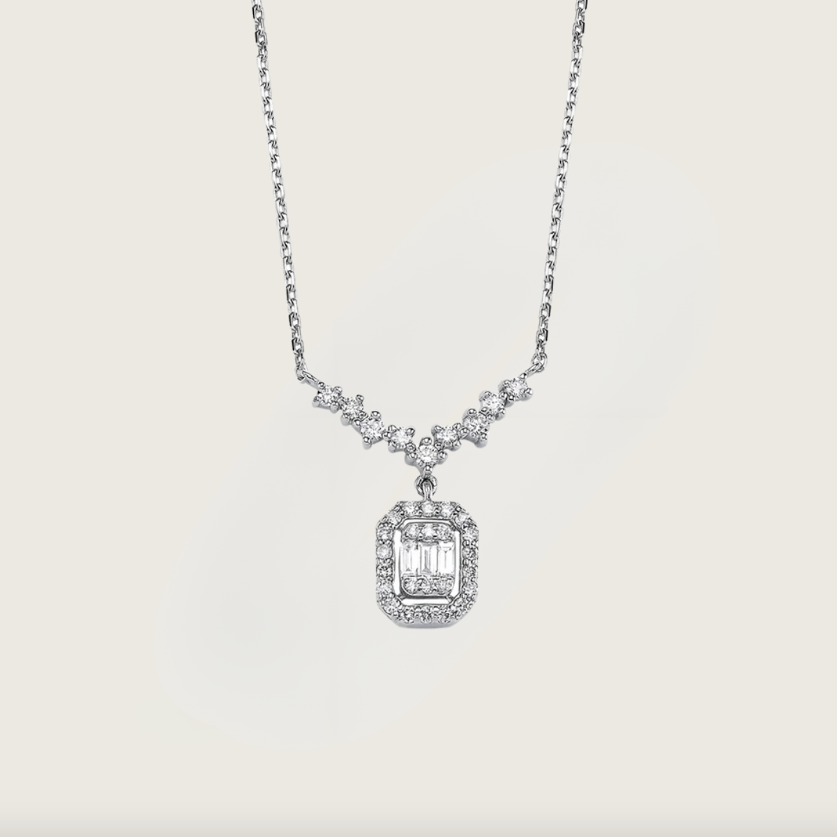 Yarı dikdörtgen formunda tasarlanan bu özel baget pırlanta kolye, modern ve şık tasarımıyla göz alıcı bir stil sunuyor. Baget pırlantaların zarif dizilimi ve çevresindeki yuvarlak taşlarla tamamlanan detayları, kolyenin benzersiz ışıltısını vurguluyor.