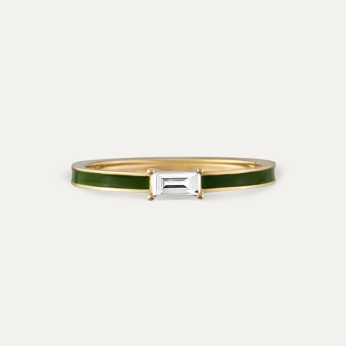Bu yüzüğün tasarımında, klasik pırlanta ışıltısını modern bir dokunuşla birleştirdik. Zarif baget kesim pırlantaların merkezde buluştuğu bu yüzük, çevresini saran canlı yeşil mine detayıyla öne çıkıyor. Sarı altının saf parlaklığı, yeşil minenin derinliğiyle kontrast oluşturarak yüzüğe dinamik bir estetik kazandırıyor. Çevresini saran ince pırlantalar, merkezi vurgularken tasarıma derinlik katıyor.