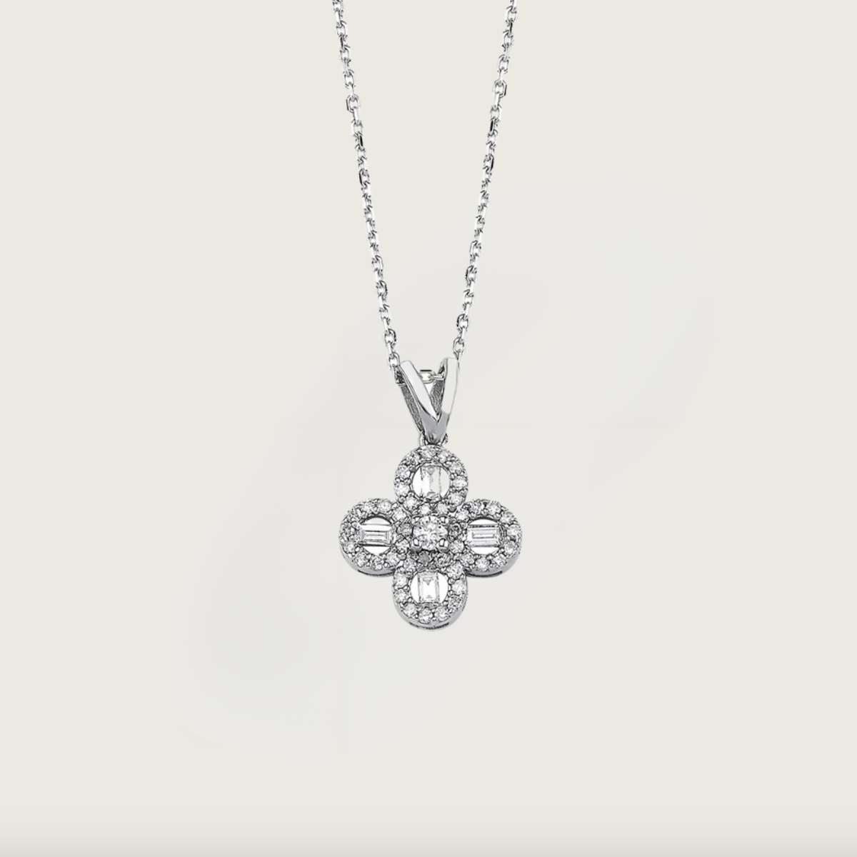 Bu zarif baget pırlanta kolye, yonca şeklindeki tasarımıyla hem şans sembolü olarak dikkat çeker hem de şıklığınızı tamamlar. Ortasında yer alan baget kesim pırlantalar ve etrafını saran taşlar, kolyeye sofistike bir hava katıyor.