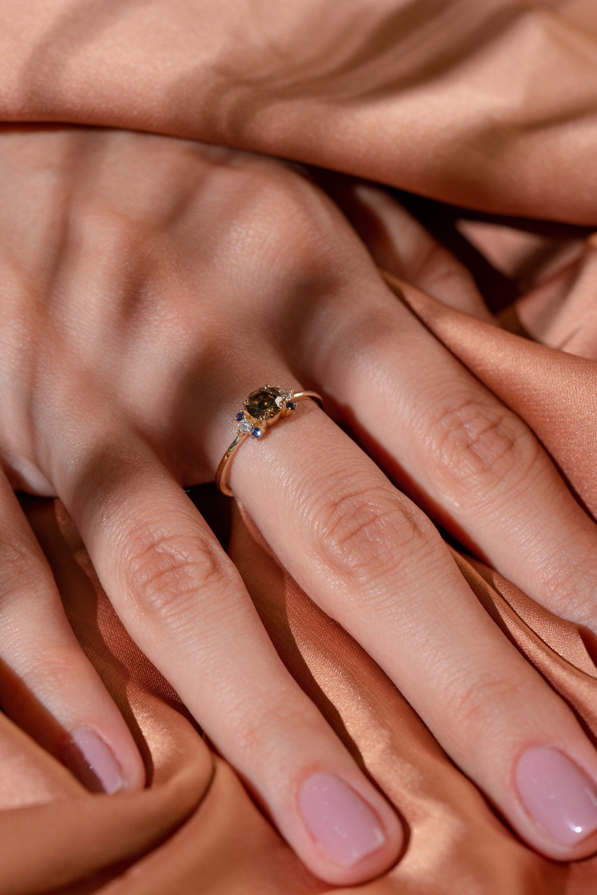 Sarı altının sıcak tonlarıyla büyüleyici safir ve pırlantaların bir araya gelmesiyle göz alıcı bir ışıltı sunuyor. Yüzüğün yuvarlak formu, safirlerin canlı renkleri ve pırlantaların parıltısıyla mükemmel bir uyum içinde tasarlanmıştır.