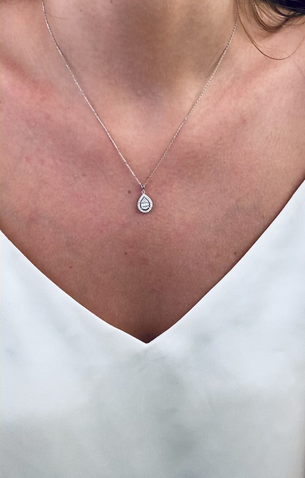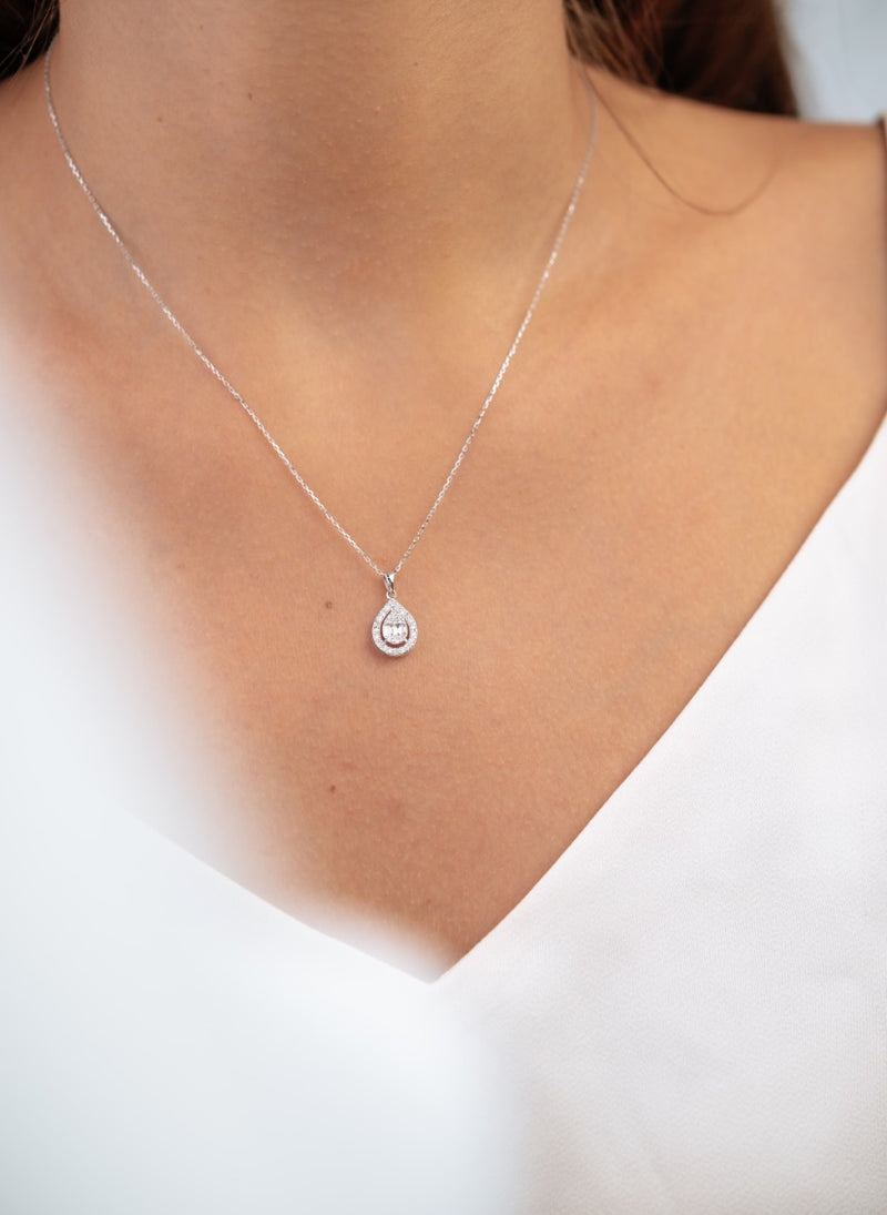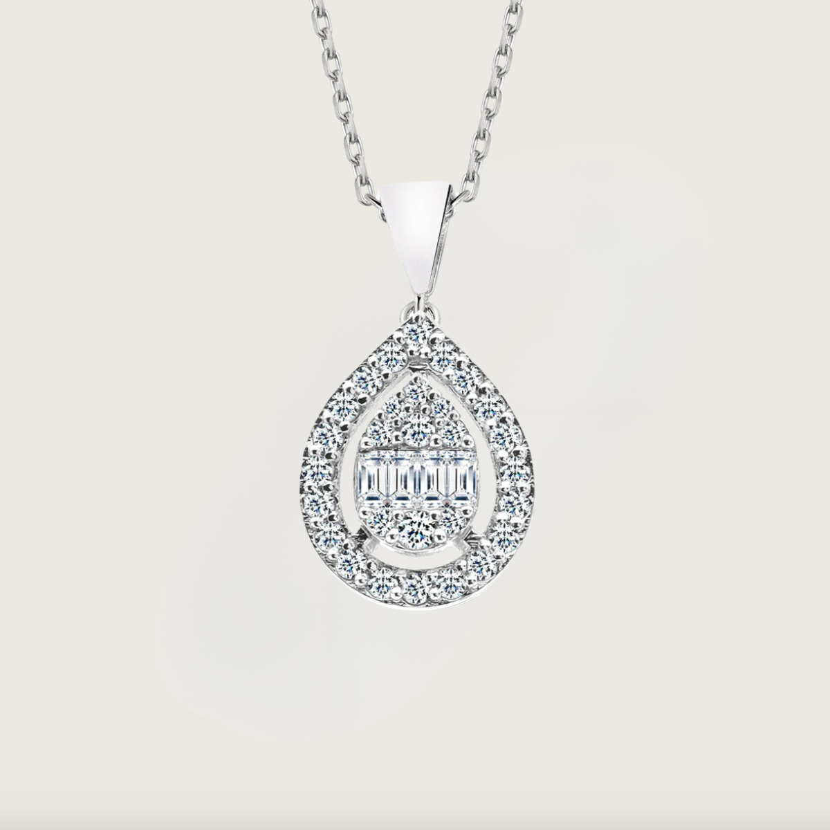 Zarif bir dokunuş ile tasarlanmış Zarafet Damlası Baget Pırlanta Kolye, günlük şıklığınızı bir üst seviyeye taşıyor. Bu zarif kolye, 14 ayar beyaz altın üzerine yerleştirilmiş baget kesim pırlantalar ile ışıldıyor ve damla formundaki tasarımıyla sofistike bir duruş sergiliyor. 45 cm uzunluğundaki zinciri ile her kombine kolayca uyum sağlar ve talep üzerine farklı boyut veya renklerde kişiselleştirilebilir.