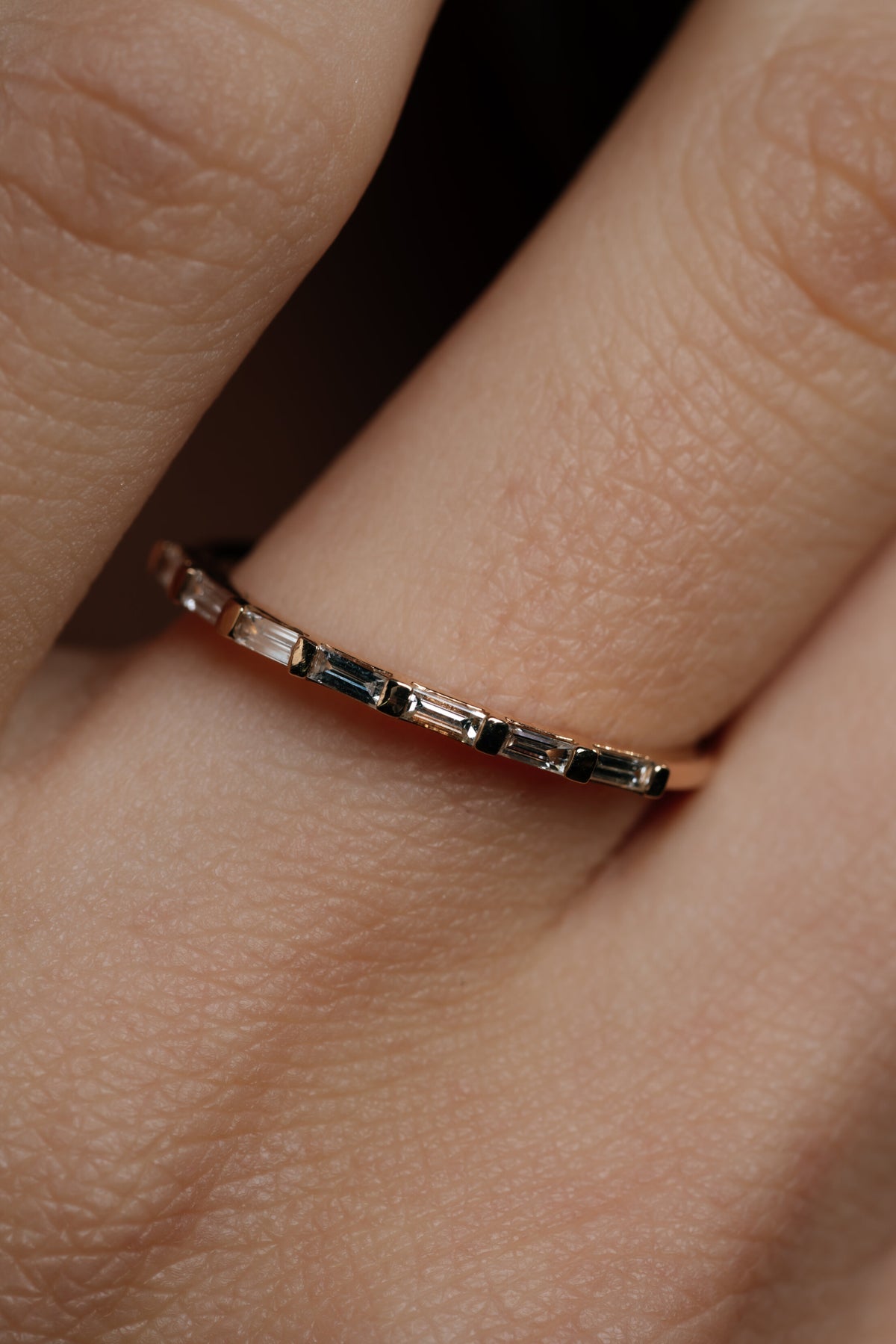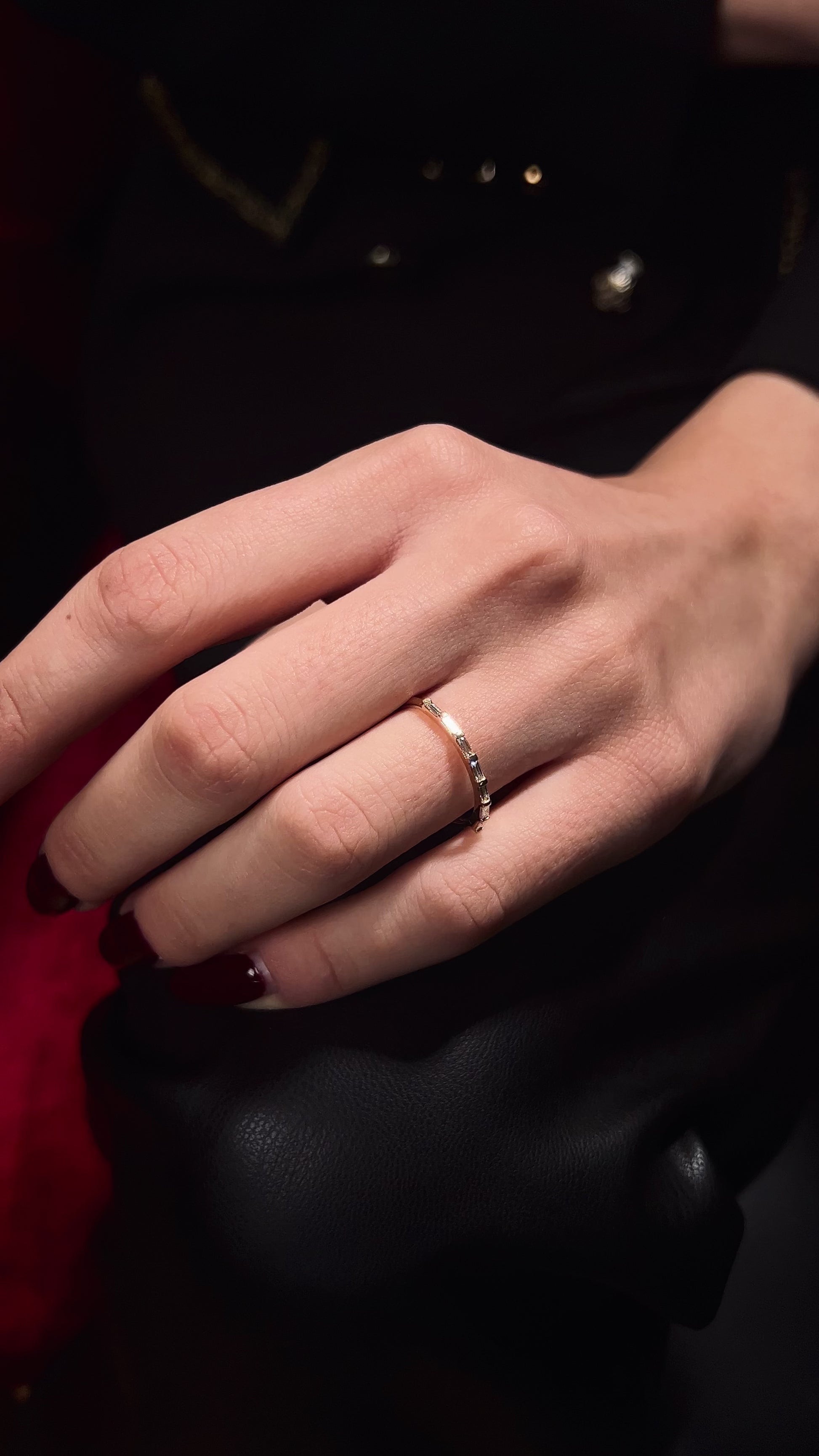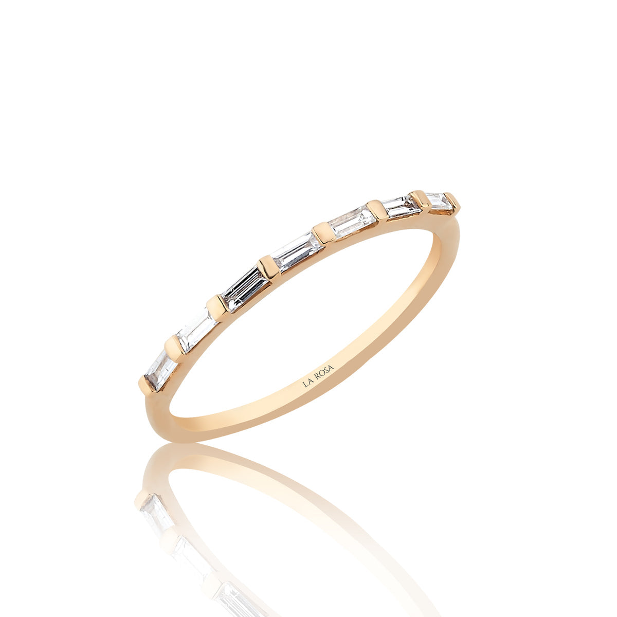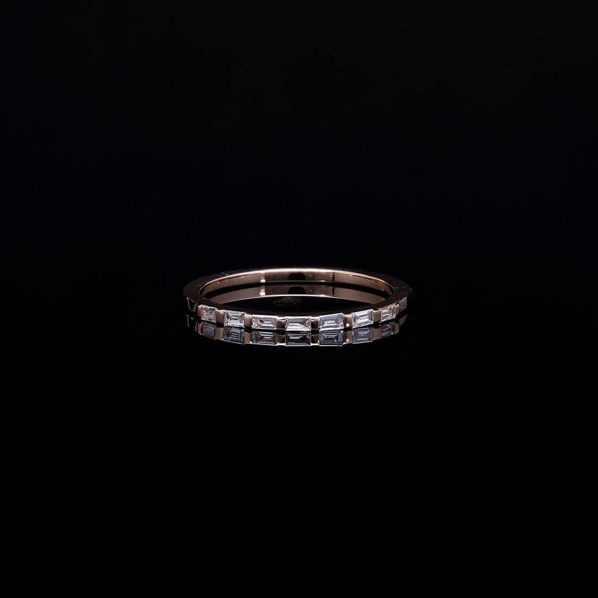 İnce ve zarif detaylarıyla öne çıkan bu rose altın yüzük, baget kesim pırlantaların sofistike düzeniyle tasarlanmıştır. Işığı mükemmel bir şekilde yansıtan pırlantalar, minimalist tasarımın gücüyle birleşerek sade ama göz alıcı bir şıklık yaratır. Hem günlük kombinlerinize zarif bir dokunuş katacak hem de özel günlerinizde zarafetinizi vurgulayacak bu yüzük, benzersiz bir stil ifadesidir.