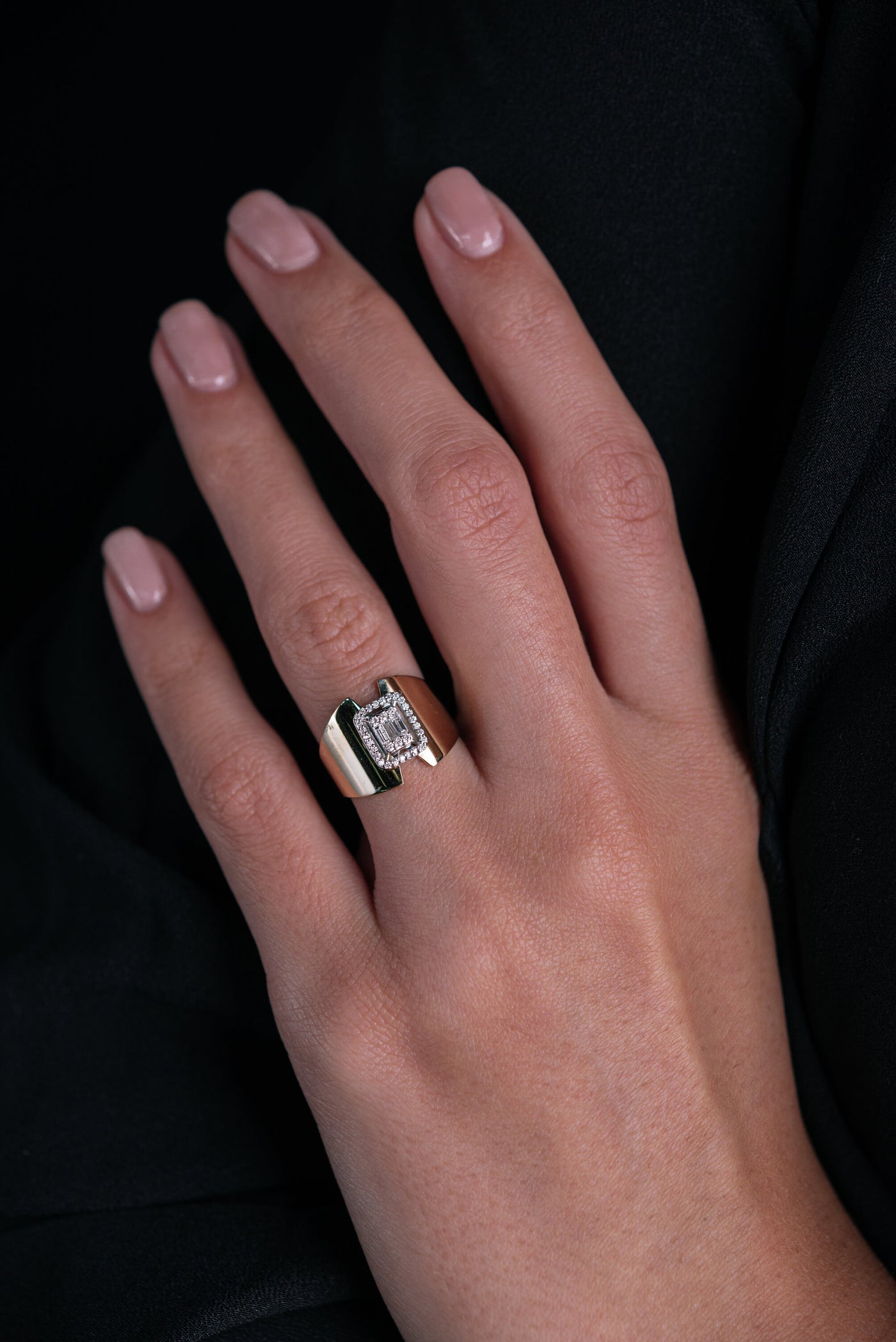 Tasarımda modernizmin ve doğanın eşsiz uyumunu yansıtan Zarif Vadi Baget Pırlanta Yüzük, geniş ve güçlü formuyla parmağınızda adeta bir sanat eseri taşır. Baget kesim pırlantanın sofistike ışığı, altın yüzüğün pürüzsüz dokusuyla birleşerek dikkat çekici bir kontrast yaratır. Yüzüğün geniş ve kavisli yapısı, derin bir vadiyi andıran zarif kıvrımlar sunarken, merkezde yer alan baget pırlanta bu vadide parlayan bir mücevher gibi göz alıcıdır.