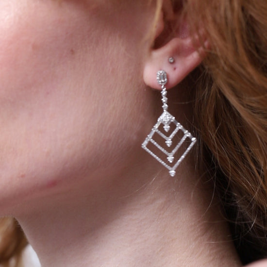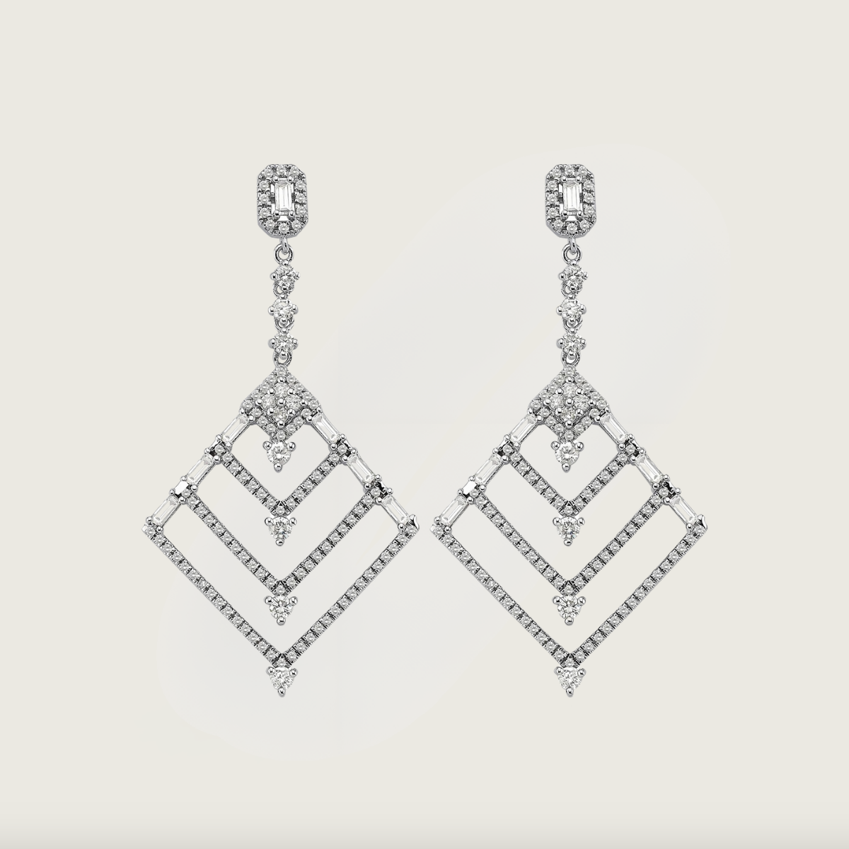 Ziggurat mimarisinden ilham alan bu benzersiz küpeler, 14 ayar beyaz altın ve baget kesim taşların zarafeti ile tasarlanmıştır. Sallantılı küpe ,çok katmanlı geometrik yapısı, antik dünyanın ihtişamını modern bir şıklıkla buluşturuyor. Her hareketinizde ışığı yakalayan bu çarpıcı küpeler, özel davetlerden günlük kullanımınıza kadar her anınıza zamansız bir dokunuş katacak. Zarafet ve tarihi bir arada taşıyan bu parça, La Rosa'nın en seçkin koleksiyonlarından biridir.