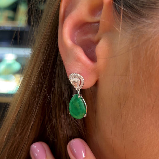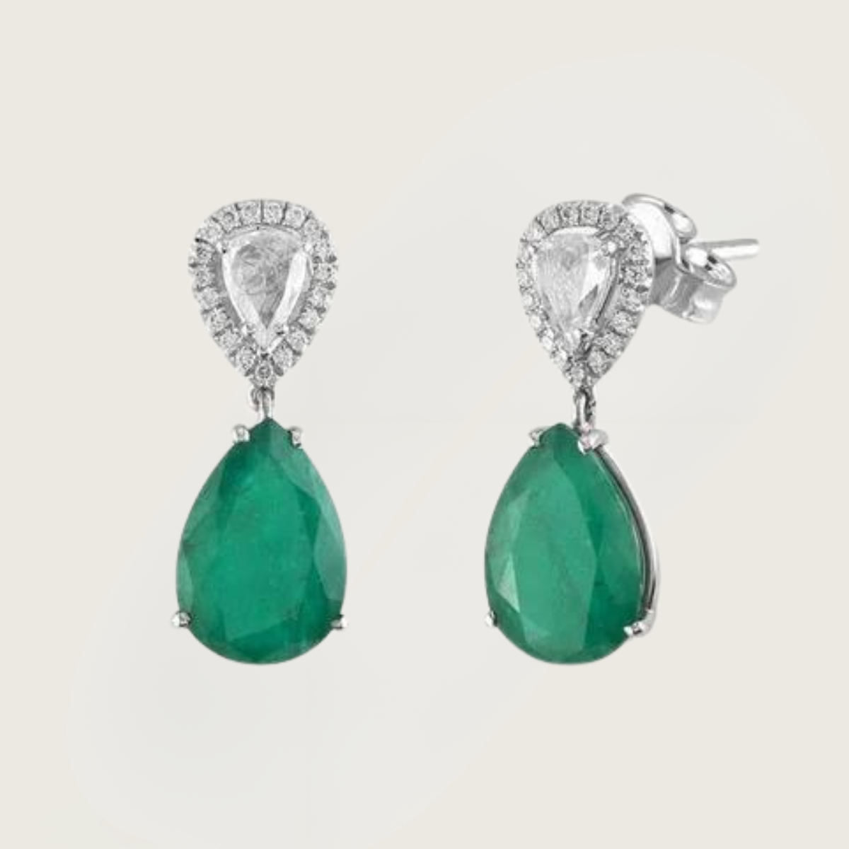 Zümrüt Gözyaşı Efsunu Küpe, doğanın büyüsünü ve zarafetini kulaklarınıza taşıyor. 14 Ayar beyaz altından üretilen bu göz alıcı küpeler, gözyaşı formundaki zümrütlerin ve pırlantaların muhteşem uyumuyla süslenmiştir. Toplam 12,76 karat zümrüt ve 1,51 karat pırlantalarla işlenmiş bu eşsiz parçalar, her anın değerini yansıtmak için tasarlandı. İncelikli bir sanat eseri gibi işlenmiş bu küpeler, zarafeti ve nadirliği simgelerken, her kıyafete asil bir dokunuş katıyor. Zümrüdün güçlü enerjisi ve pırlantanın ışıltısı bir araya gelerek, sofistike ve unutulmaz bir duruş sağlar.