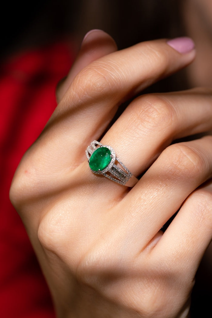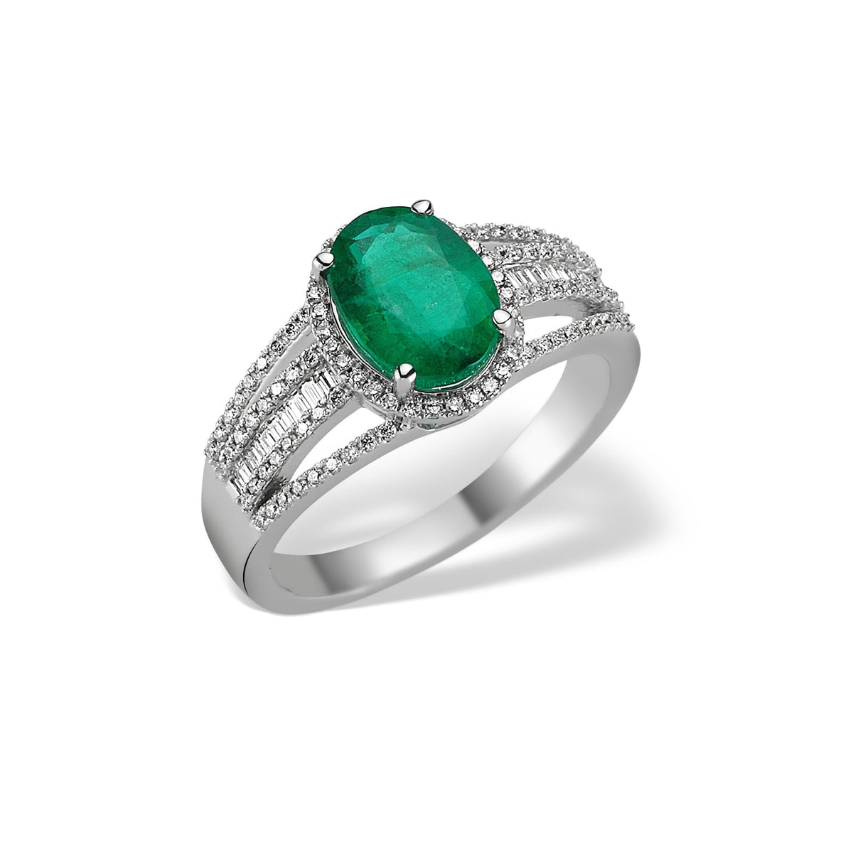 Merkezinde dikkat çekici oval kesim zümrüt bulunan bu yüzük, yanlardaki parlak baget ve yuvarlak pırlanta detaylarıyla tasarlanmıştır. Beyaz altının ışıltısıyla tamamlanan bu yüzük, klasik ve modern tasarımı bir araya getirerek her anınıza şıklık katmak için mükemmel bir tercih.